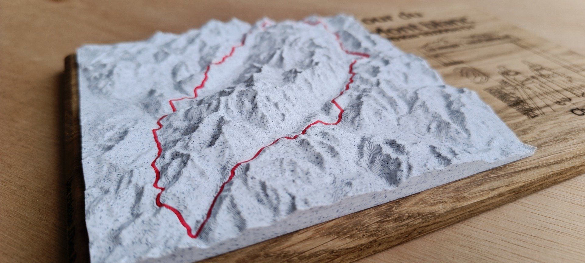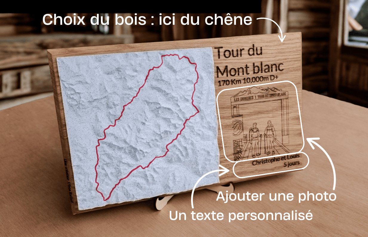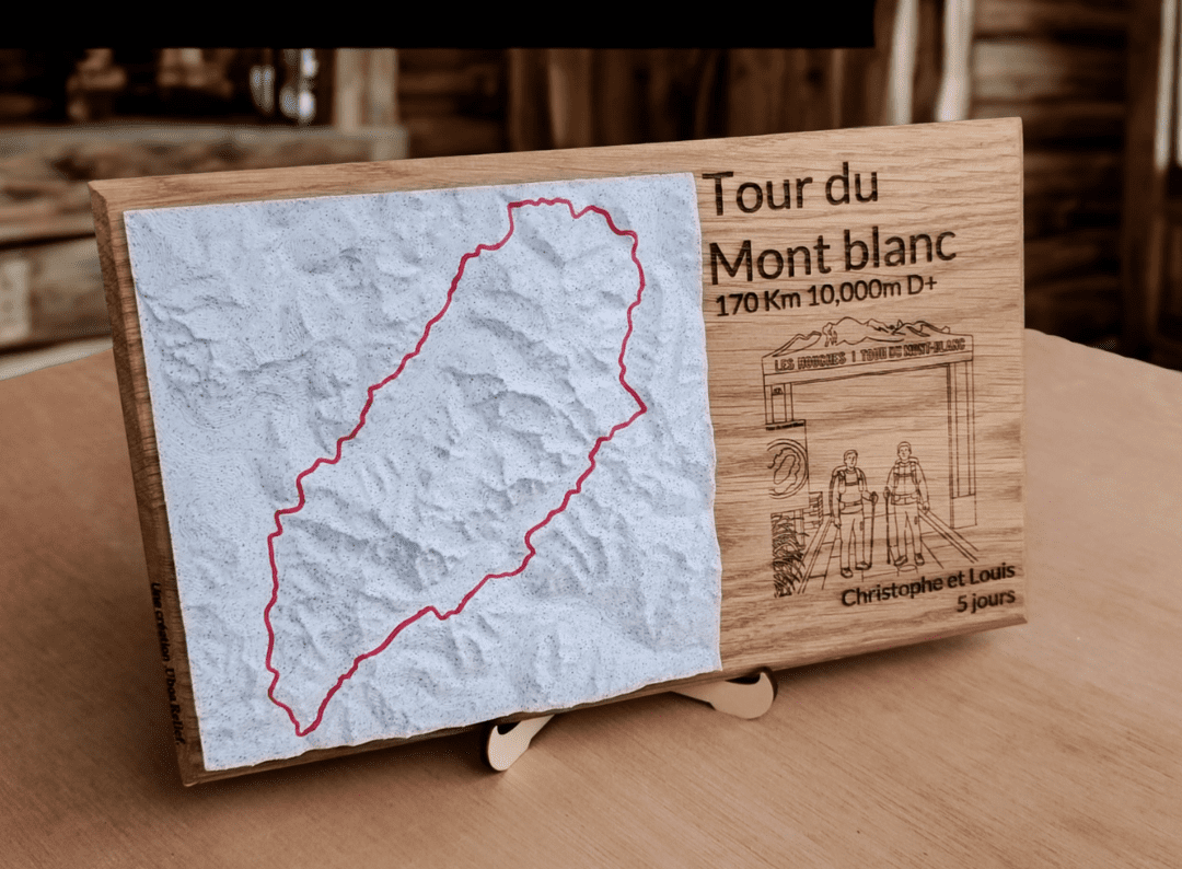 Imprimée en 3D avec une précision topographique fidèle à l’itinéraire, puis montée à la main sur une planche en bois gravée, cette création artisanale est le souvenir idéal de votre trek — ou le cadeau parfait pour un passionné de montagne et de grands treks.